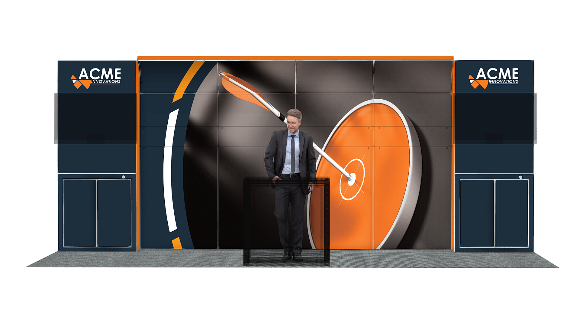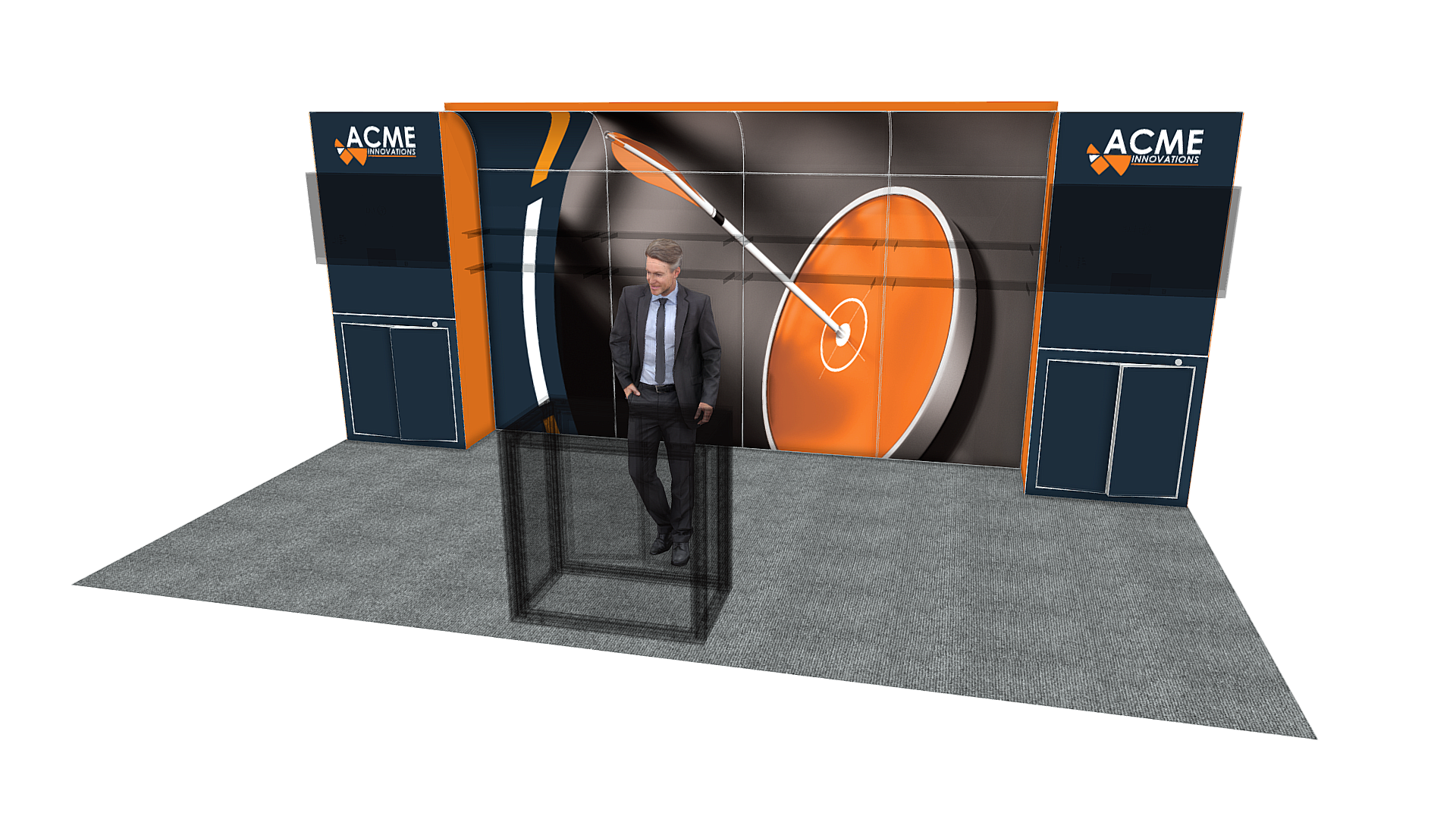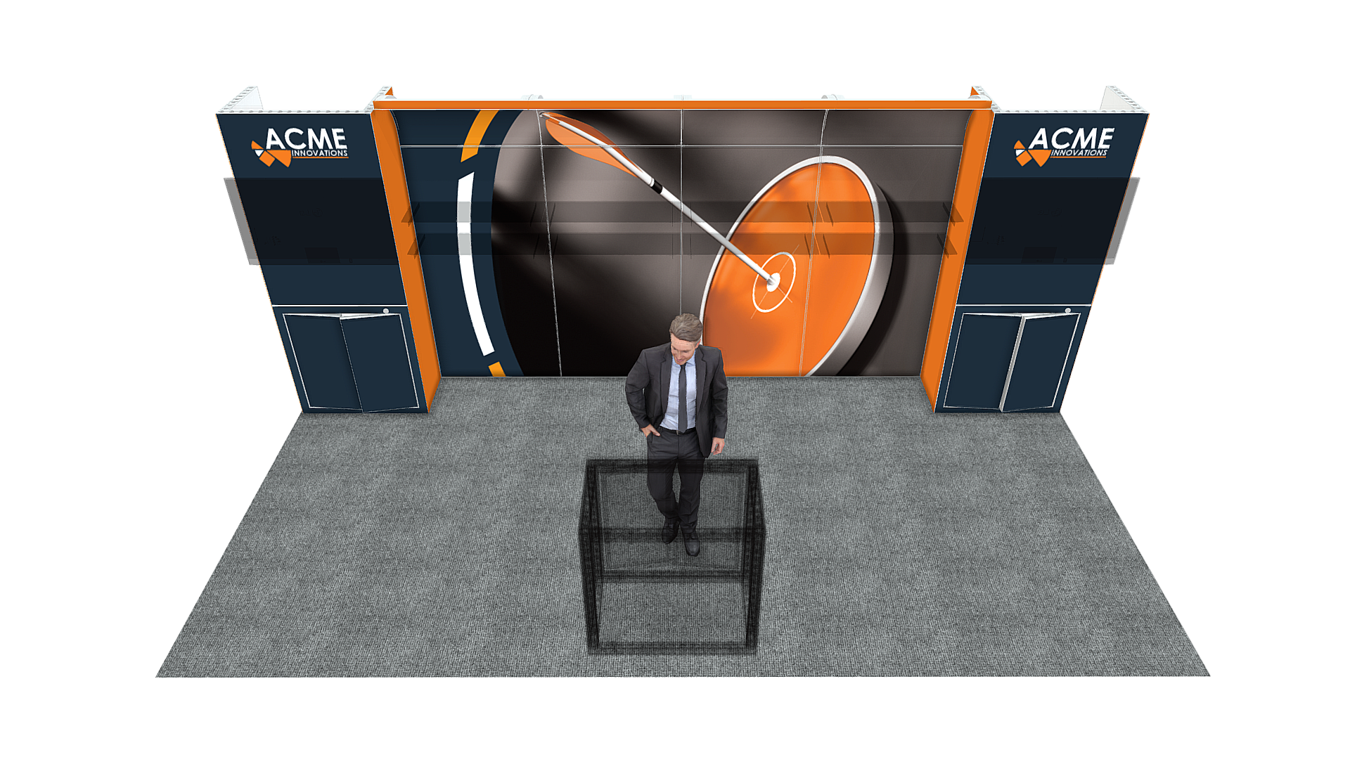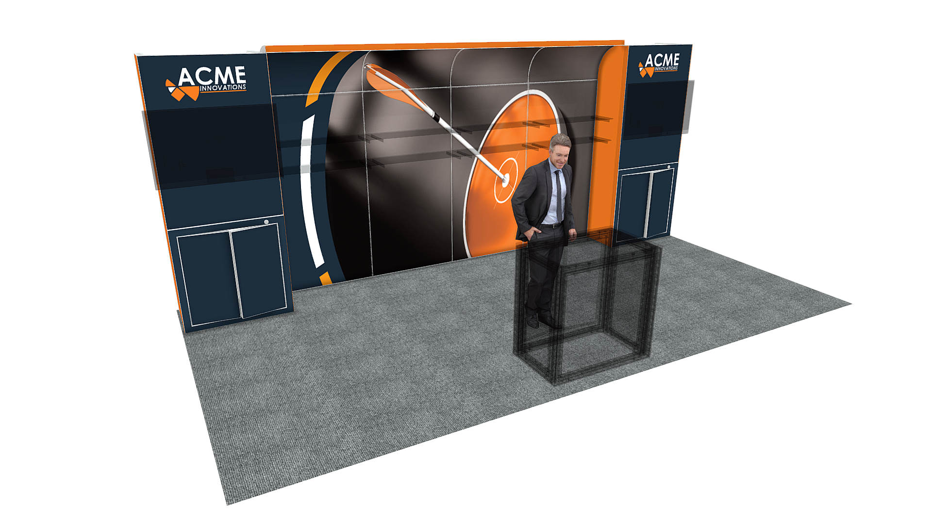 Our Price: Starting At $5990Embark 207 blends efficient shelving and storage capabilities with a modern, flowy design! With two built-in storage cabinets, additional shelving units (optional) and an extended backwall, this booth provides the perfect blend of style and functionality. The gentle curves draw attention, making your exhibit stand out, while the storage areas ensures you have plenty of room to bring in extra products to offer to clients.
